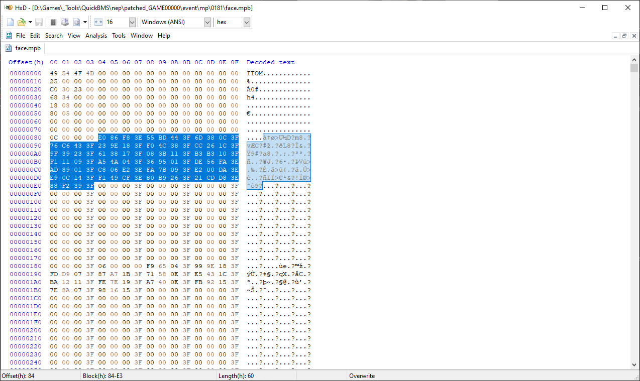 After sorting through all of these indices and rearraging them into overlapping groups of 6 (praise rectangular text selections!), I was finally ready to insert them into the .mpb file.