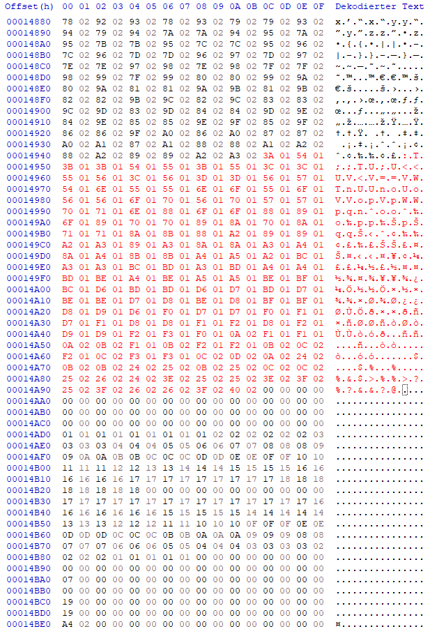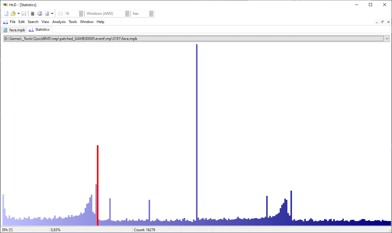 This is the point in time where I first shifted my attention to the face.mpb file accompanying the texture. Looking at the byte value distribution (and ignoring zero), there were significant spikes for 0x3f and 0x80. This is a strong indicator that the file contains a lot of floating point values, as 0x3f800000 is the IEEE 754 representation of the value 1. 0x3f in particular is the first byte for all floating point values beween 0.5 and 1. The next highest count was for the byte value 0x3e, which is the first byte of floats between 0.125 and 0.5.