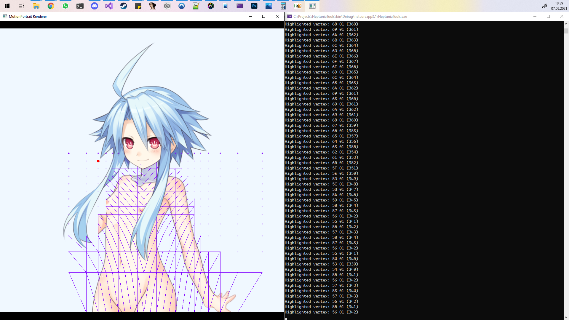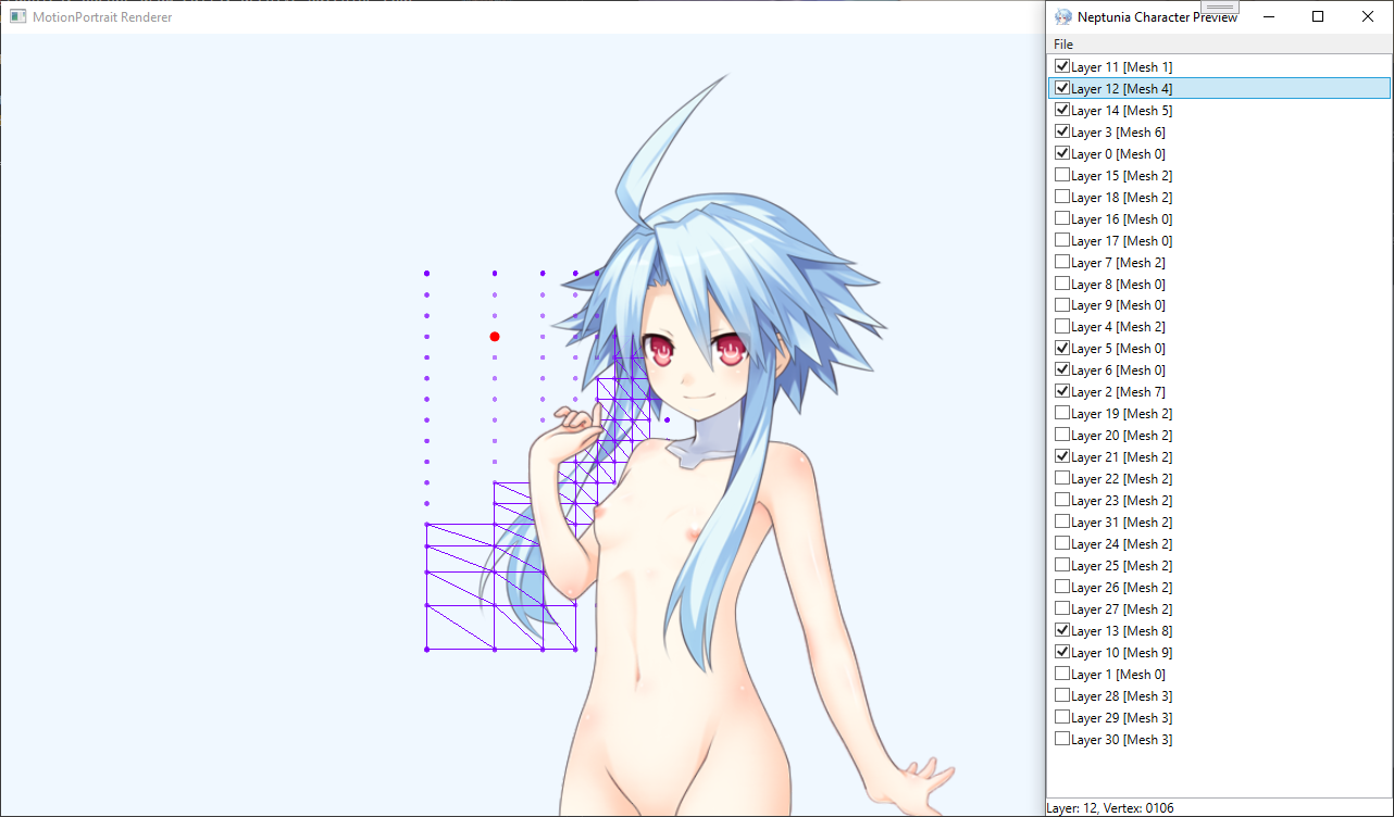 While I was at it, I also build a simple WPF app to control the renderer, with the option to toggle each layer on and off, and highlight a layer/vertex. Since I would need to edit the meshes for other characters as well, I also added a display with the currently selected vertex index at the bottom.